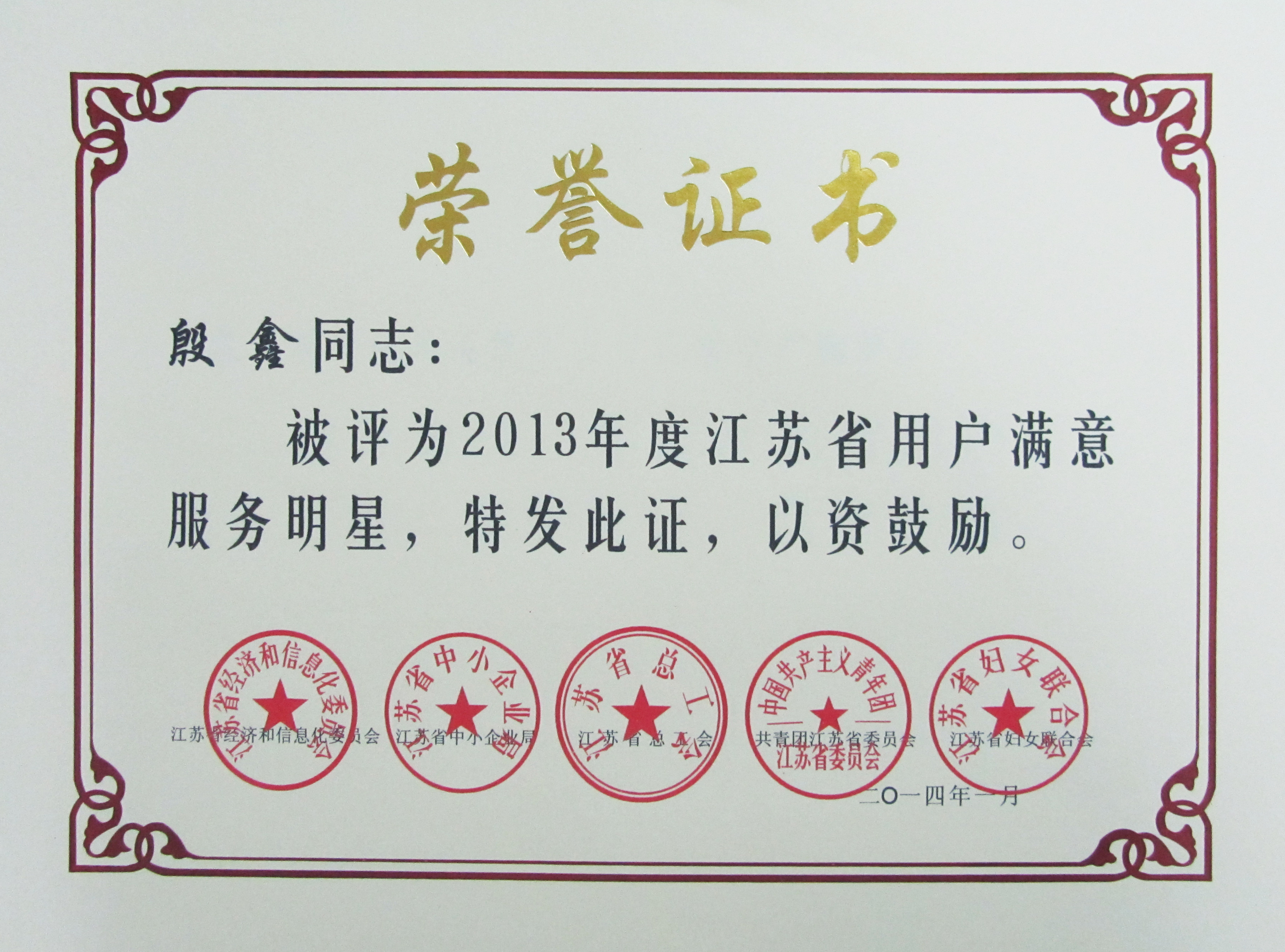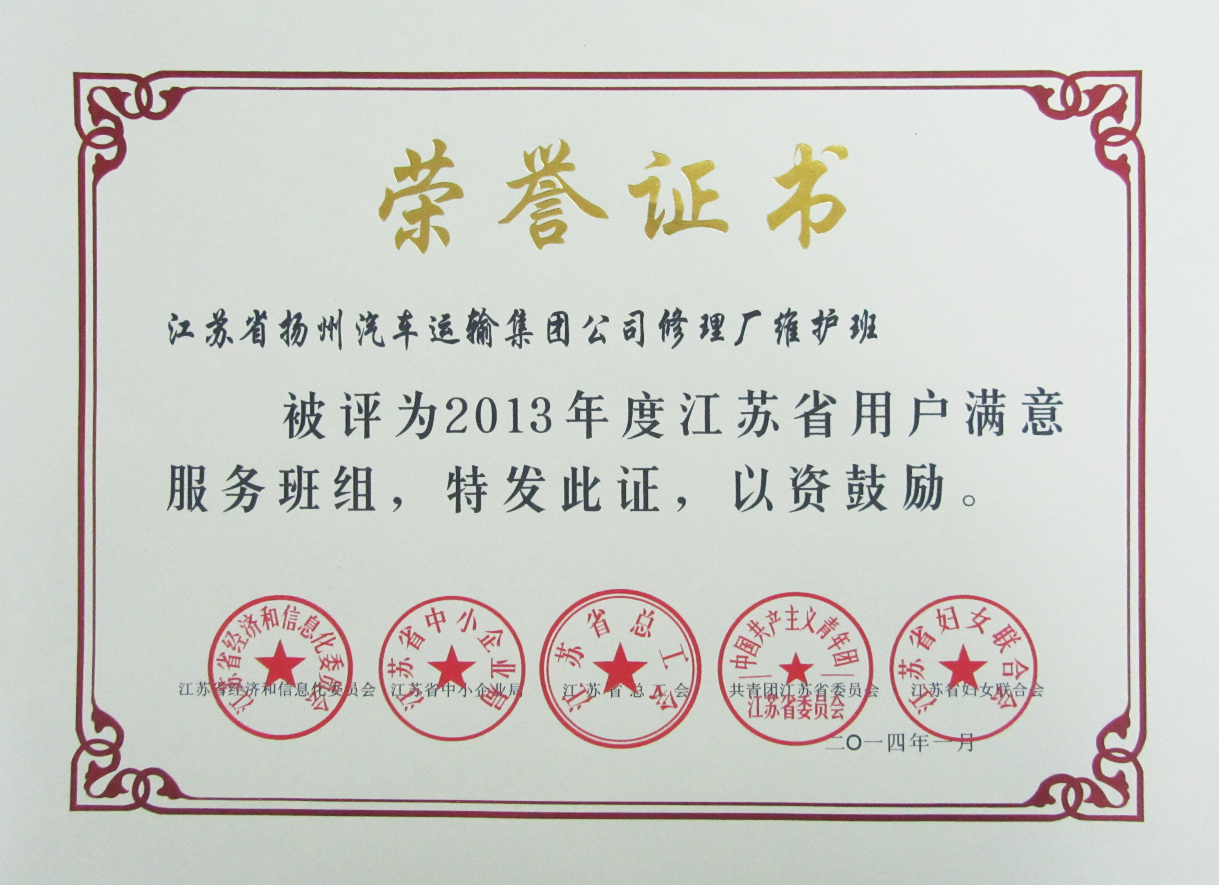 日前,由江蘇省經濟和信息化委員會、江蘇省總工會、江蘇省中小企業局等五家單位聯合開展的2013年度創建“用戶滿意服務”活動評審結果揭曉,我司修理廠維護班榮獲2013年度江蘇省“用戶滿意服務”班組,快客分公司殷鑫同志榮獲2013年度江蘇省“用戶滿意服務”明星稱號。