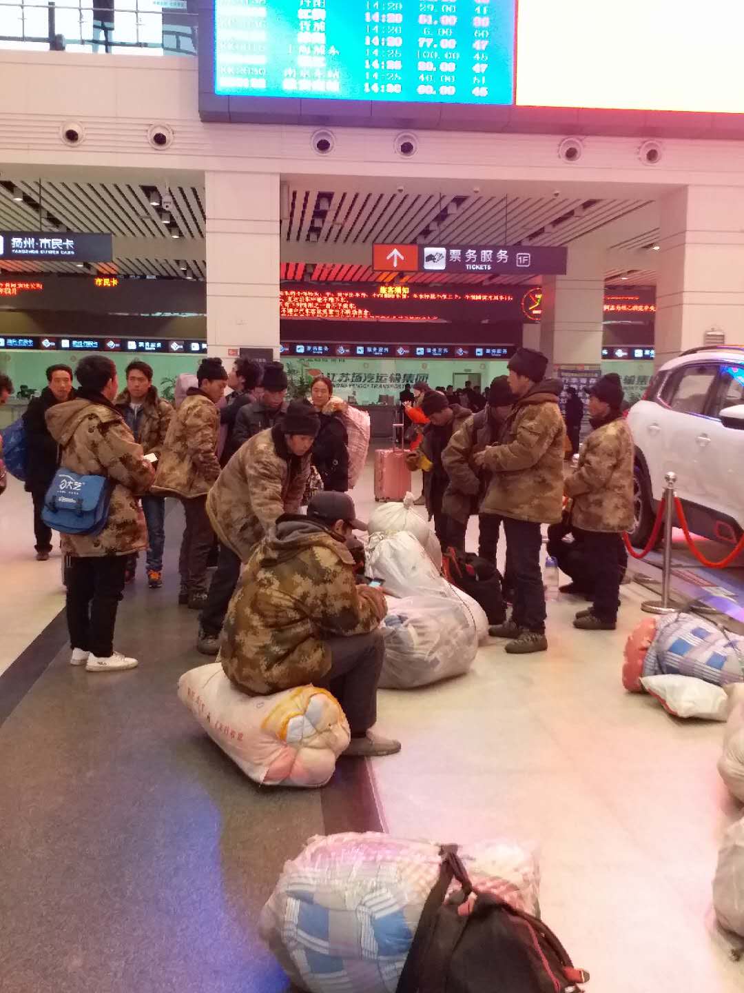 21位在揚(yáng)州某工地打工的安徽無(wú)為縣農(nóng)民工,昨天工地開始放假,于是今天大家集中提前返鄉(xiāng)。得知情況后,班長(zhǎng)尹海霞便帶領(lǐng)工作人員熱情地幫助大家購(gòu)買起票來(lái),為節(jié)約因排隊(duì)造成的時(shí)間緊張,尹班長(zhǎng)隨即吩咐班組人員利用工友的手機(jī),幫助農(nóng)民工進(jìn)行網(wǎng)上購(gòu)票,不到二十分鐘,解決了農(nóng)民兄弟的購(gòu)票問題。隨行中一位已在揚(yáng)州打工三個(gè)年頭的“小工頭”夏師傅感慨萬(wàn)千,動(dòng)情地說(shuō):“沒想到今年春運(yùn)前買車票這么容易,多虧了車站工作人員的幫忙”。
