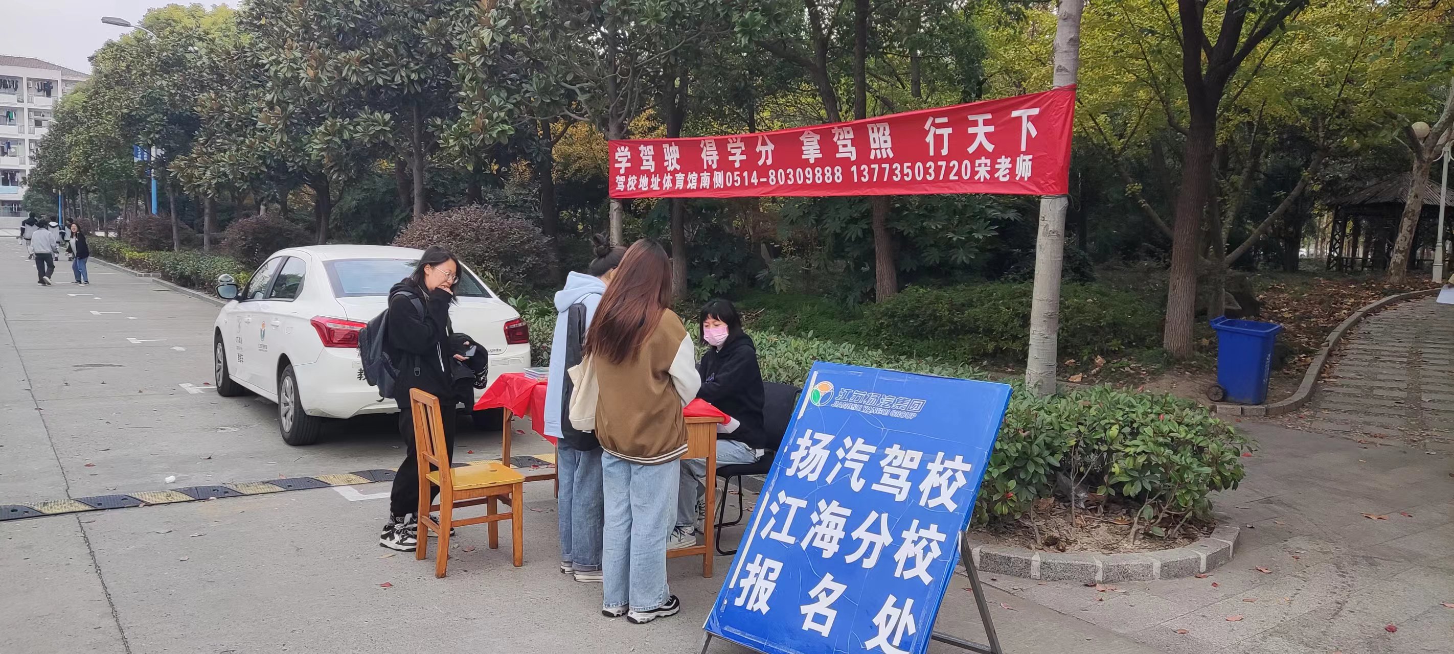 宣傳臺前,工作人員為前來咨詢的學生分發宣傳單,講解學車流程,以及在揚汽駕校學車的優勢和相關優惠政策,前來咨詢的學員絡繹不絕,工作人員都給予了細心的講解,同時也感受到了學生對學車的熱情,取得了很好的宣傳效果,促進了招生工作的開展。據統計,本輪招生共發放傳單200余份,提供詳細咨詢服務100余次,現場招募到新學員26人,另有多人達成學駕意向。