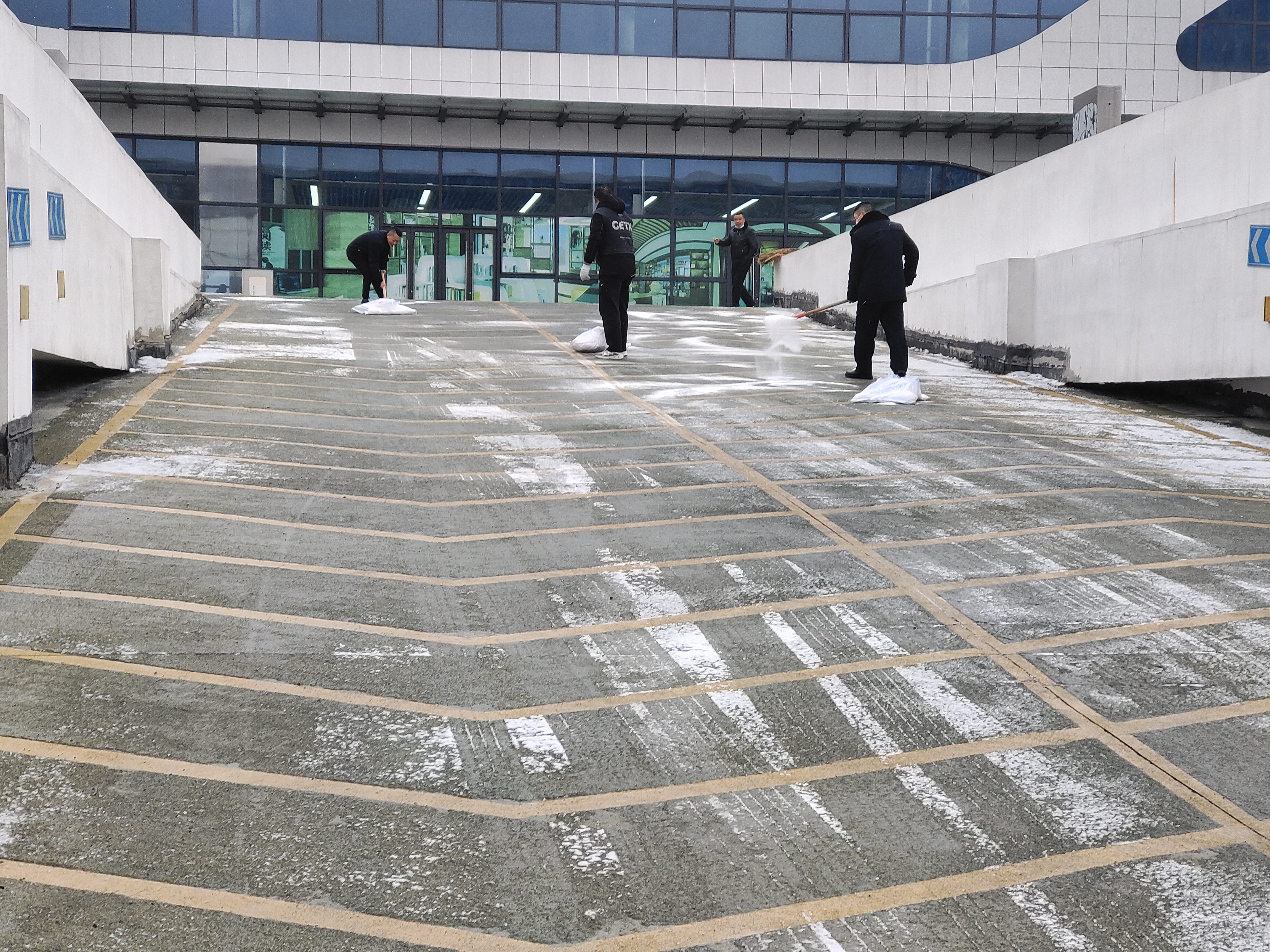 在揚汽修理廠,為防止廠區地面冰凍,各部門、班組迅速對全廠范圍內的積雪進行清除,對廠區內主干道、例保通道、倉房陰面等區域噴撒融雪劑,為例保通道鋪上防滑草墊,確保廠區道路暢通。