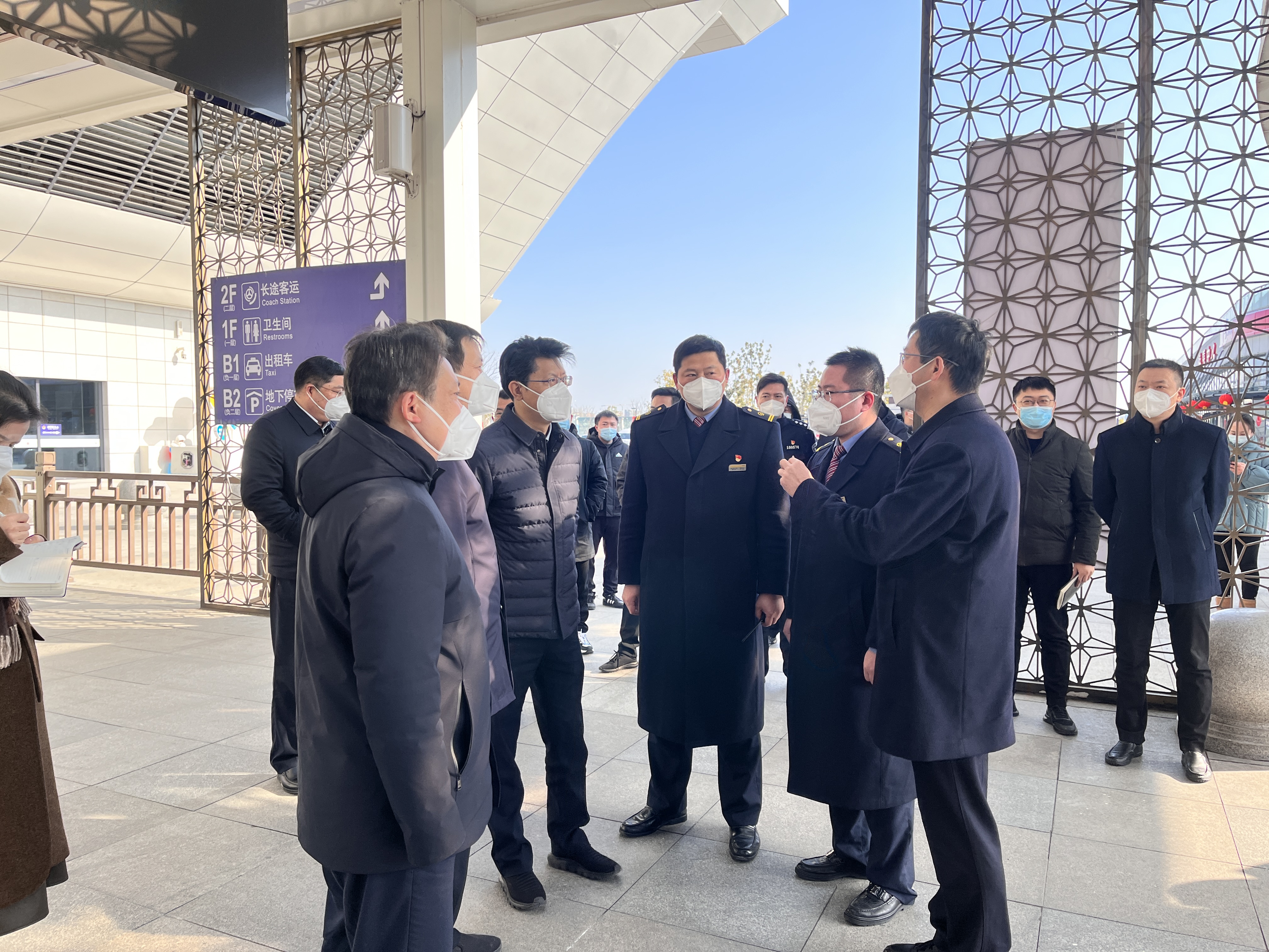 王進健一行詳細詢問了春運期間車站線路、班次、運力、客流等運行情況,深入了解了常態化疫情防控、安全生產、值班值守等工作落實情況等。