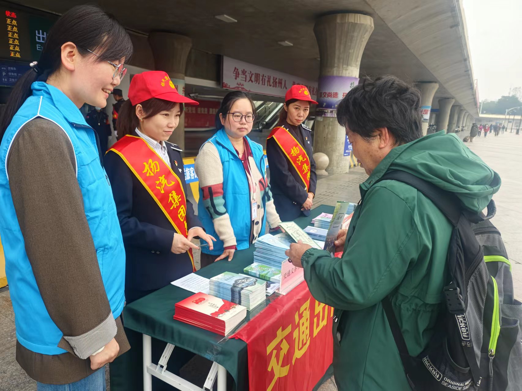 活動(dòng)現(xiàn)場(chǎng),志愿者們有序?yàn)槁每吞峁﹩栐冎敢、維持秩序、文明勸導(dǎo)等志愿服務(wù),熱情為旅客們介紹揚(yáng)州的美景、美食以及旅游線路的規(guī)劃,用熱情的服務(wù)態(tài)度和專業(yè)知識(shí),給旅客們帶來了更好地幫助。