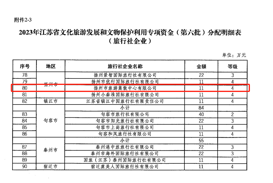 近日,江蘇省財政廳、江蘇省文化和旅游廳公示了2023年江蘇省文化旅游發展和文物保護利用專項資金旅行社企業名單,揚州旅游集散中心成功入選。